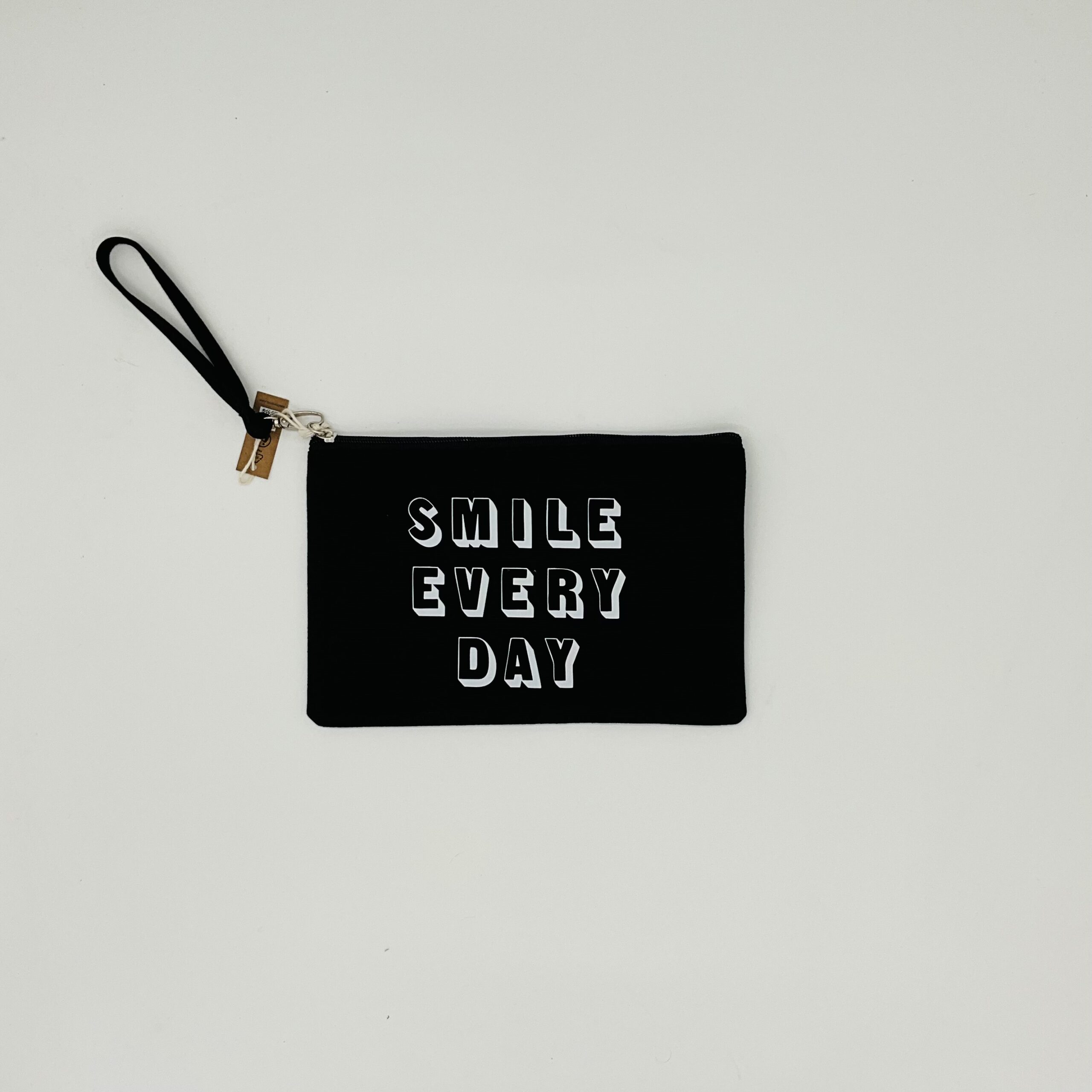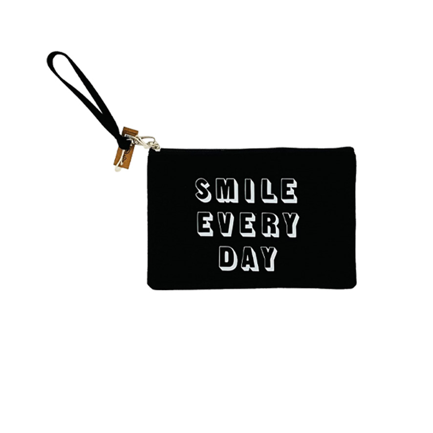 Pochette “Smile Every Day” – in collaborazione con Marco Bettini -100% cotone Canvas. Logo stampato su entrambi i lati. Pochette multiuso con zip con colore a contrasto, cinturino da polso staccabile, chiusura con zip. Lunghezza manico: 15 cm. Dimensioni: 26×17 cm, capacità: 1 litro.